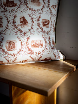 Toile de Jouy is a traditional French fabric that features monochromatic scenes printed in a single colour against a white background, usually depicting traditional bucolic scenes. Donna Wilson’s interpretation of this timeless fabric is Set the Scene, a visual narrative that offers a glimpse into the rich heritage of Fogo Island.